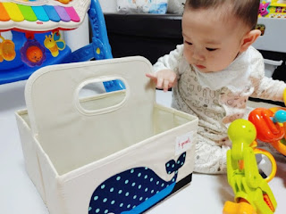 이렇게 기저귀를 넣고 들어도 무리가 되지 않습니다 손잡이가 따로 있어 이동하기에도 참 편한 정리함! 게다가 아기가 여기저기 물어봐도 들려올 정도로 가볍고 휴대도 아주 좋습니다.