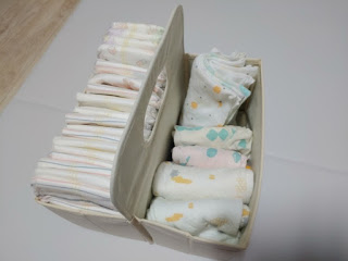 깔끔하게 들어가는 기저귀입니다.여러 가지 종류의 기저귀를 넣으셔도 됩니다. 옆에는 이렇게 언제든 뽑고 사용하기 편하게 가재 손수건과 옷도 함께 넣어줬어요! 손수건도 넣고 아기가 옷을 넣어도 전~득 차지 않는 넉넉한 사이즈!